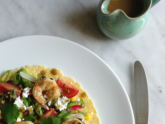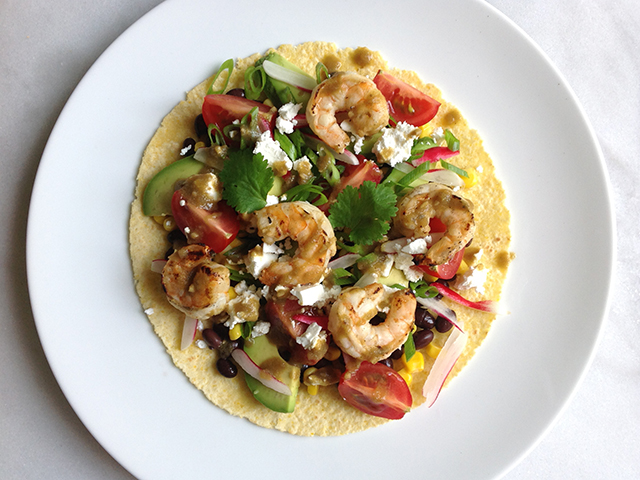 My chile shrimp with corn tortillas is a perfect example. I whip up some green chile marinaded shrimp (it cooks super quick on the BBQ) or you could grill flank steak, chicken or simply lots and lots of roasted vegetables. Even better, serve a couple of choices – why not? Serve it with warm tortillas (look ma no wheat!) and lots and lots of sides. You like cheese? Great toss it on there! Beans your worst enemy? Give ‘em a pass.