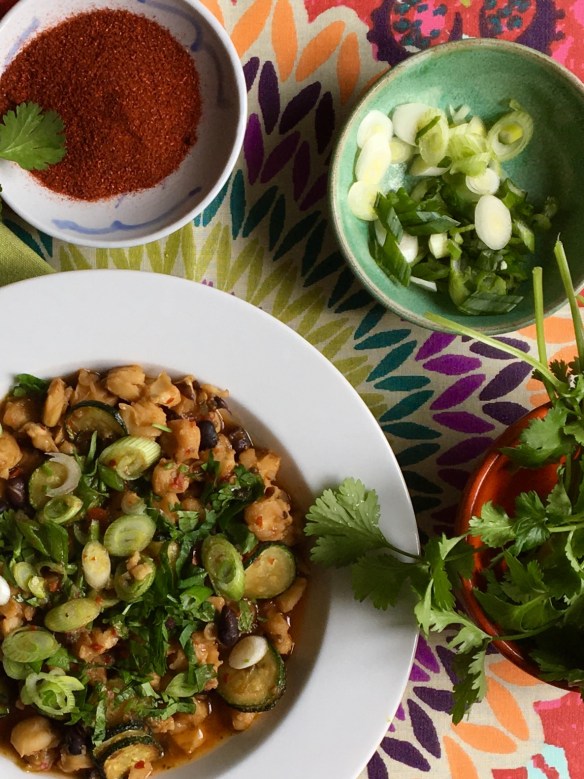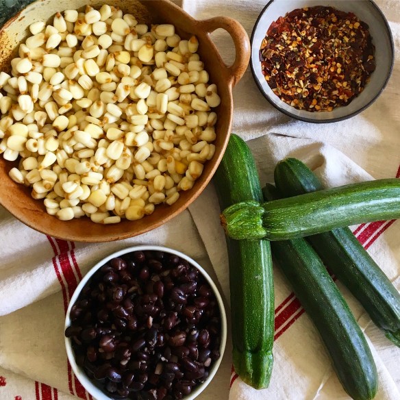 Just before serving, warm the oil and sauté the zucchini over medium-high heat, just until tender. Add the garlic and cook for another minute. Stir in the drained and rinsed black beans and the zucchini into the posole. Taste and season with salt and more chile if you desire.