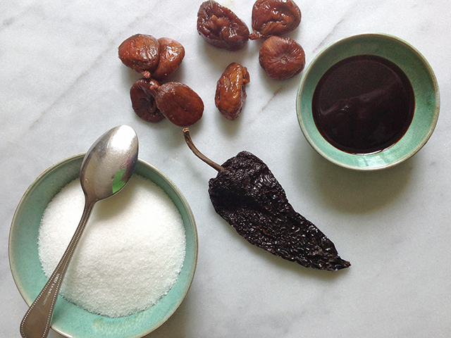 Now turn up the heat a little and add the cornmeal or masa, a tablespoon at a time, stirring well after each addition, and cook it in until the whole chili has a silky, rich texture. Note that cornmeal will give a texture to your sauce, while the masa will simply thicken it. I prefer the cornmeal, but it’s a matter of personal taste.