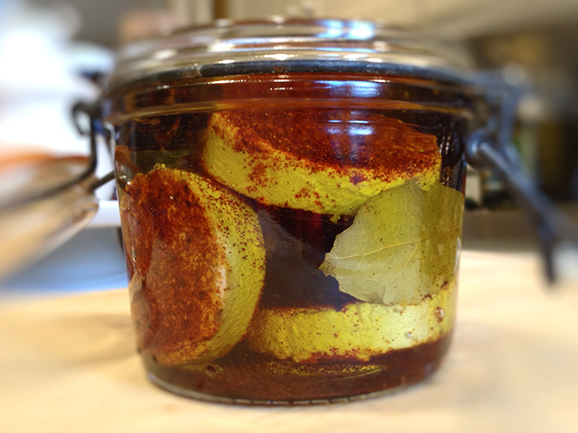 Take a small, scrupulously clean jar (a 1 pint capacity Kilner or Le Parfait jar is a great choice and looks nice too). Fill it ¾ of the way with olive oil. Place the ancho chile powder on a small plate. Place a disc of goat’s cheese in the ancho chile so it’s lightly coated with chile powder. Flip and repeat on the other side. Gently, place the disc into the jar filled with olive oil. Repeat with the remaining discs. Place the two chile pods and the bay leaf in the jar and top up with olive oil, if needed, so all the ingredients are covered in oil. Close and place in the refrigerator until ready to use.