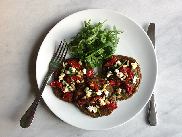 Serve hot, topped with the goat’s cheese, sun blushed tomatoes and pine nuts.