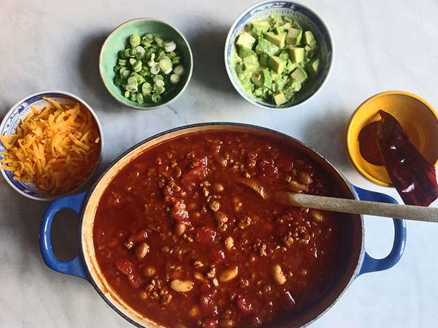 Brown the meat, add water and the Campfire Chili seasoning and simmer 30 minutes. Add tomatoes (and beans, if you’re using them). Simmer 10 minutes. If you want more heat, crumble the dired chiles and add a bit at a time to get to your preferred ‘burn’ level.