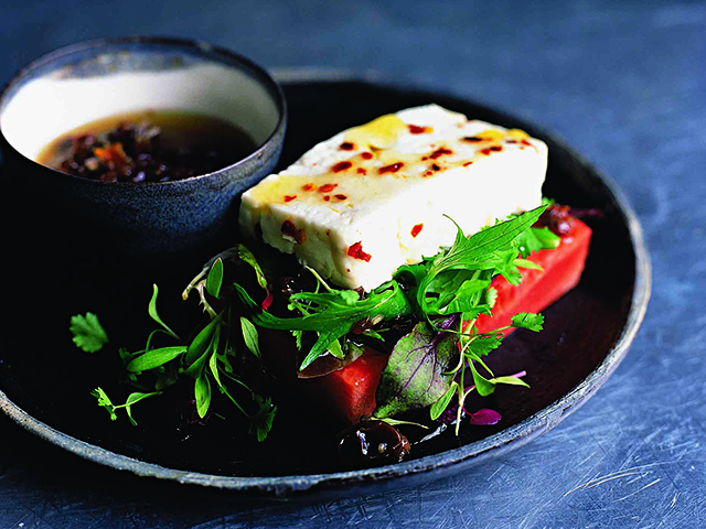 The contrasts in this recipe are wonderful; I love the warmth of the feta and the heat from the chile against the cold sweet watermelon. The dressing is great with white beans, crumbled feta and some lettuce leaves. Or, if you prefer to keep it simple, just use a little lemon-infused olive oil to dress the watermelon. Perfect as an appetizer or light lunch.