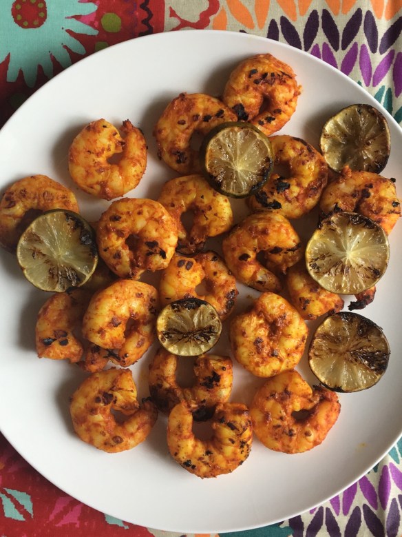 Get your grill heated up to medium-high. Brush the lime slices on both sides with the olive oil and give them a sprinkle of salt. Place the shrimp on the grill and the lime too. You can use skewers but I think a good pair of tongs is your best friend. Grill until nicely seared on one side then flip and repeat. Shrimp cook fast – they only need a few minutes – so stay focused.