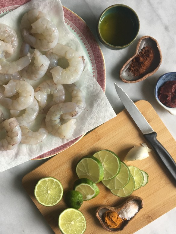 Mix the tomato paste, garlic, lime juice, cayenne and turmeric powders, olive oil and sea salt. It should form a thick paste. Place the shrimp in a bowl and coat with the paste. Pop in the fridge and let them hang out for half an hour or so.