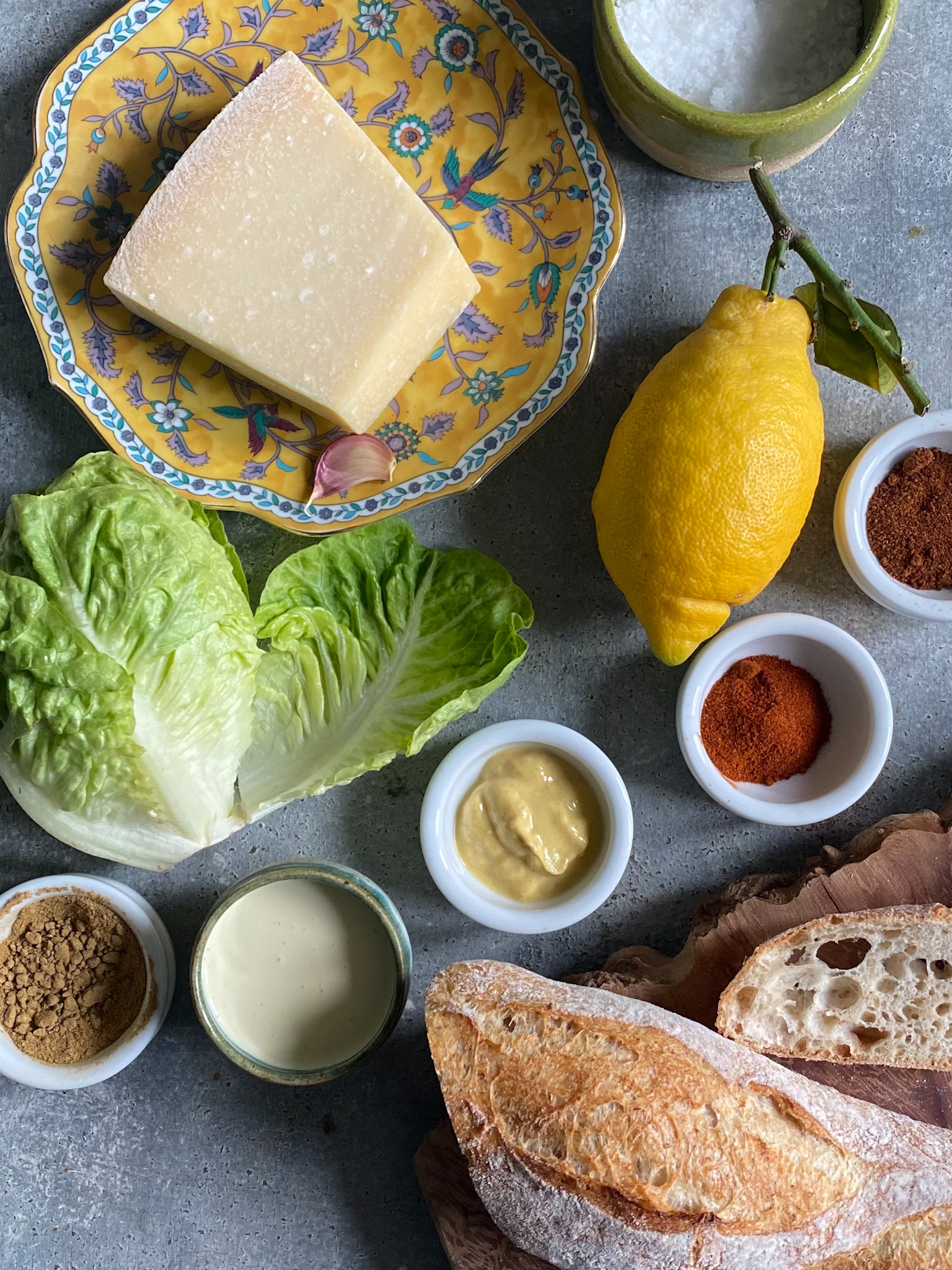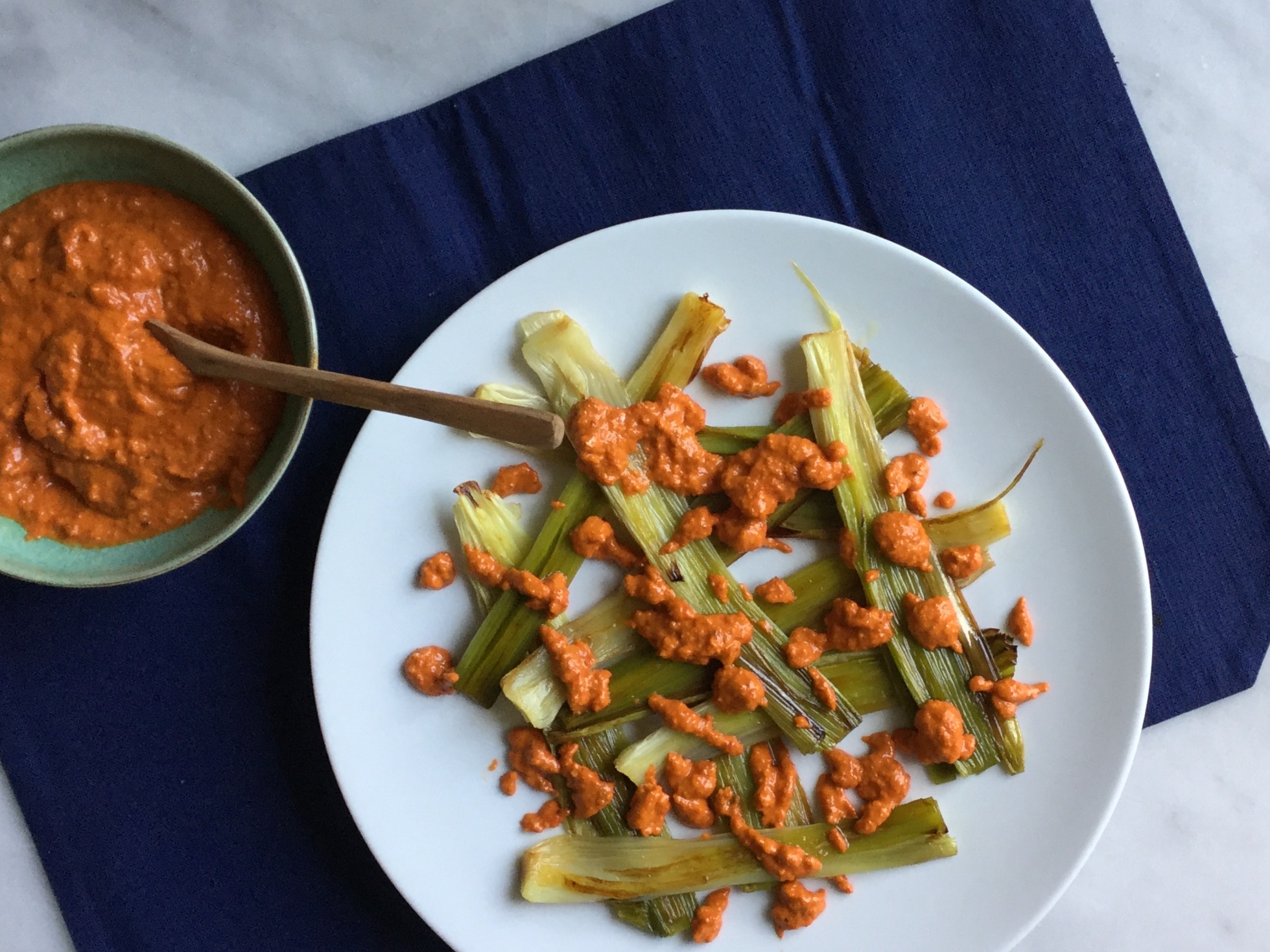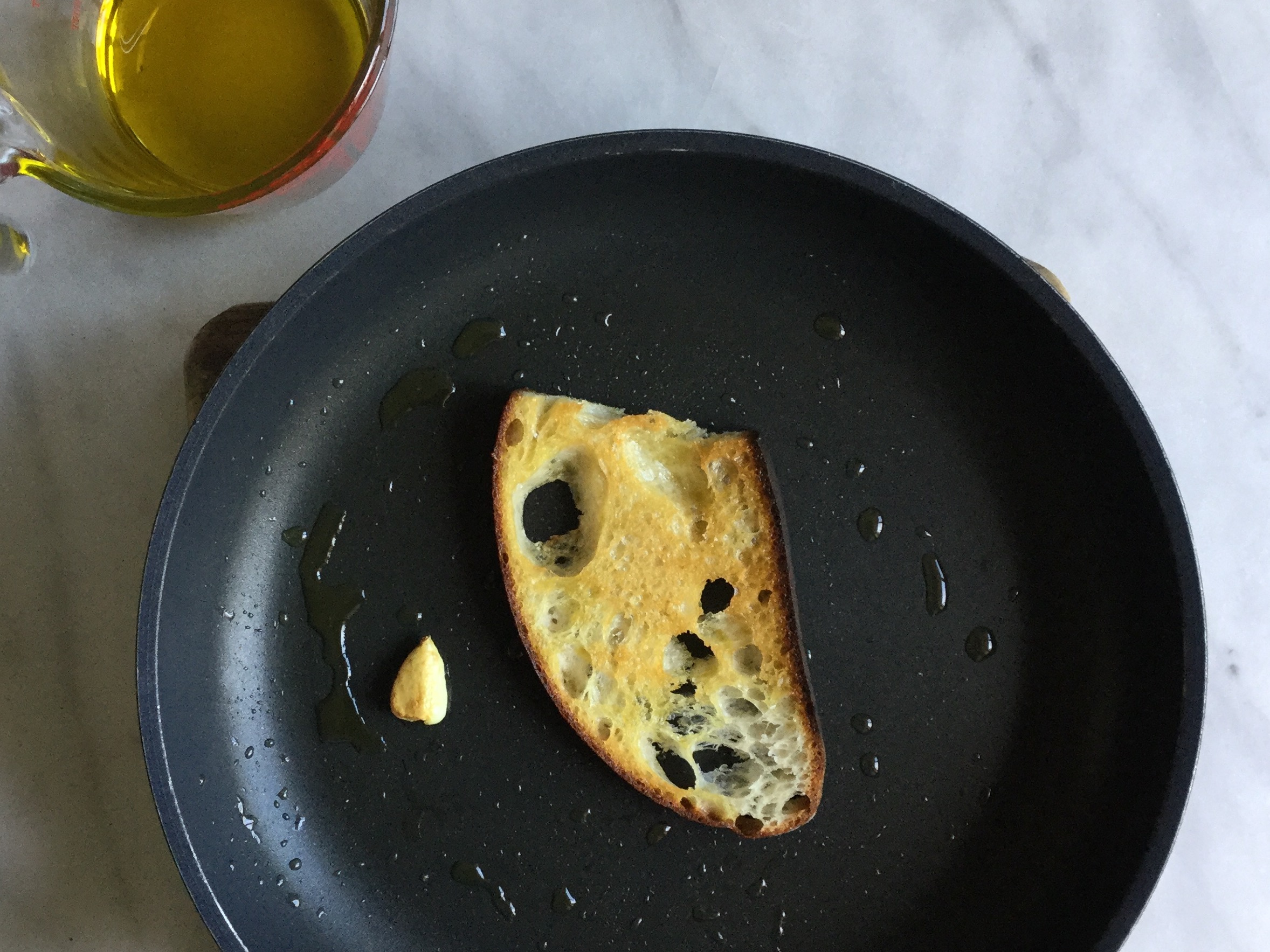 To make the romesco sauce, toast the almonds in a frying pan over medium heat for a minute or too until they release a nutty aroma. Remove the almonds and drizzle some of the oil in the pan. Add the garlic clove and the slice of bread. Sauté for a minute or two until the bread is nicely toasted on both sides and the garlic clove is golden.