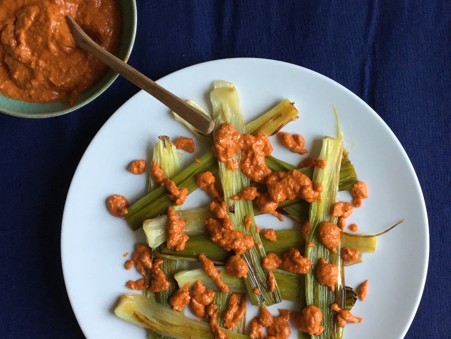 Trim the top green section from the leeks and the roots at the stem end. Slice them in half lengthwise and place them in a roasting tin. Drizzle generously with olive oil and salt. Place them in the oven and roast until nicely browned. Turn and continue cooking until softened and browned all over.