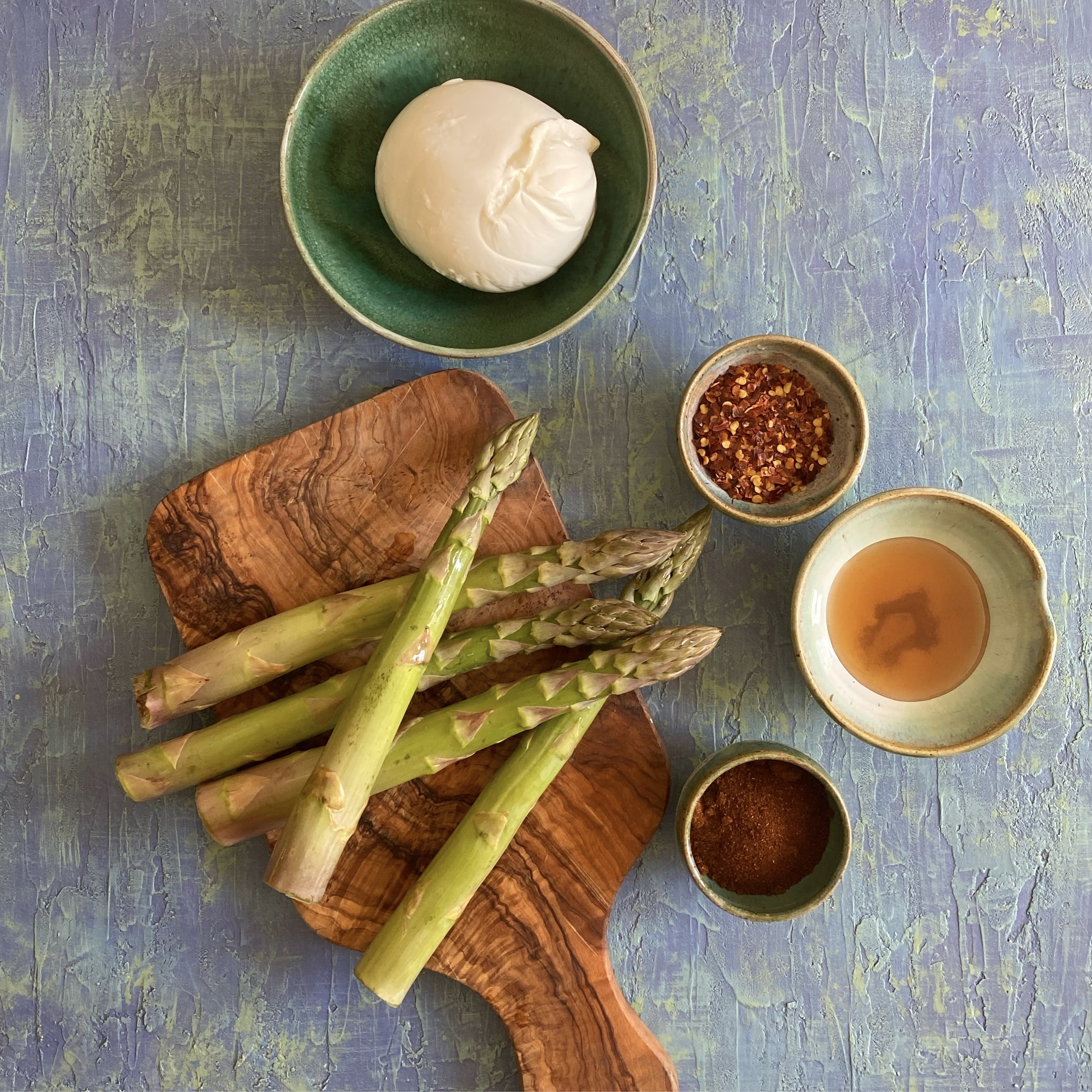 Brush the asparagus with some oil and place on the hot grill. Turn the spears about every thirty seconds to get nice grill marks all around the spears. Remove from the grill. Place the mozzarella on a plate, place the spears around it, and drizzle over the dressing. Sprinkle with some chile caribe.