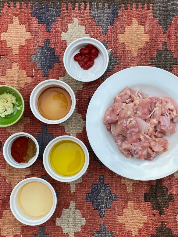 Cut each thigh into about 4 chunks. Place the chicken in a bowl. In a separate bowl, mix together the marinade ingredients. Pour over the chicken and stir to coat. Refrigerate for several hours.