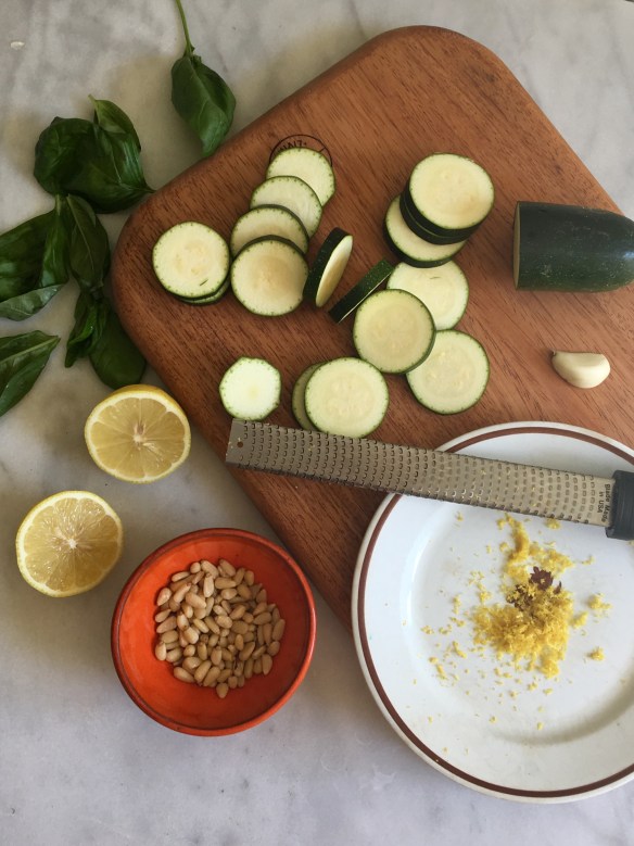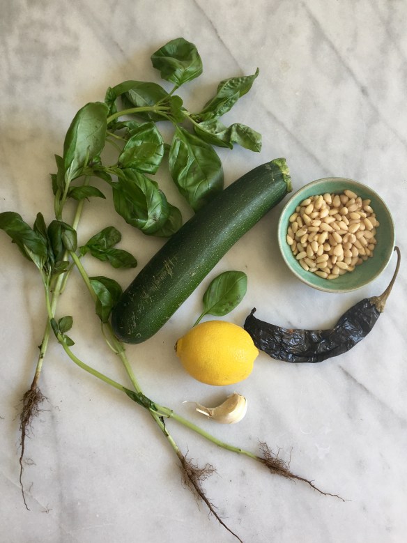 And while you’re at it, pick a zucchini while it’s still small and cute and before it looks like a club wielded by a grumpy giant. Make a quick chile sauce, toast some pine nuts – aka piñon or pignoli – tear some basil leaves and you are done. Because who wants to spend summer in the kitchen when all the fun is happening outdoors?