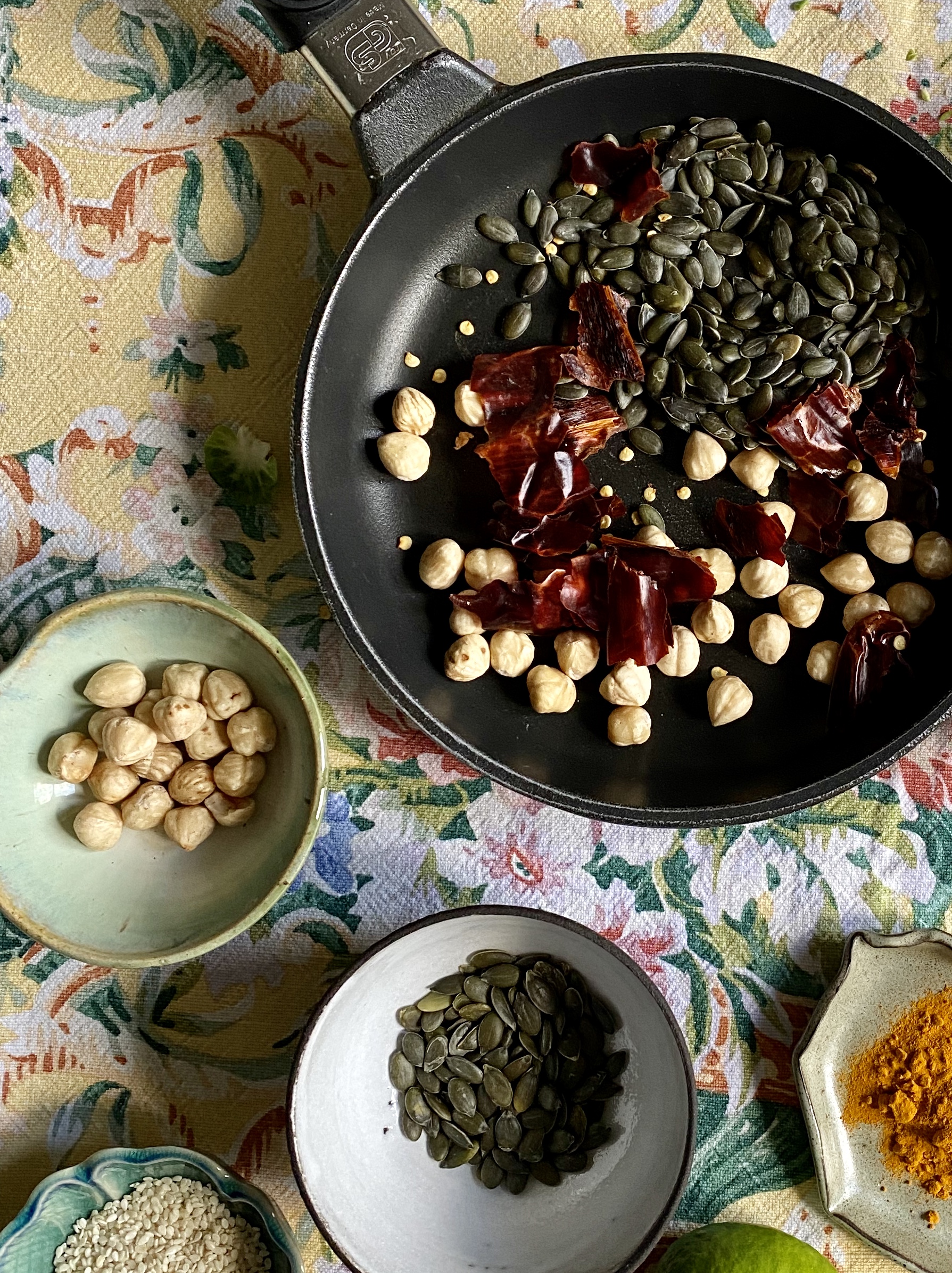 While the sweet potatoes are doing their thing, make the chile, lime, pecan butter. Place the softened butter in a small bowl, add the pecans, chile, lime zest and about 1/2 tsp of salt. Mash it around like you’re a toddler playing with your food. Taste and add more chile or salt.
