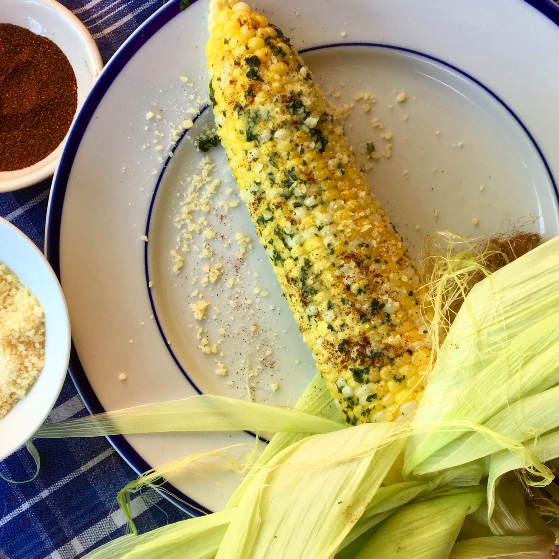 Corn on the cob with basil butter, parmesan cheese and chipotle chile