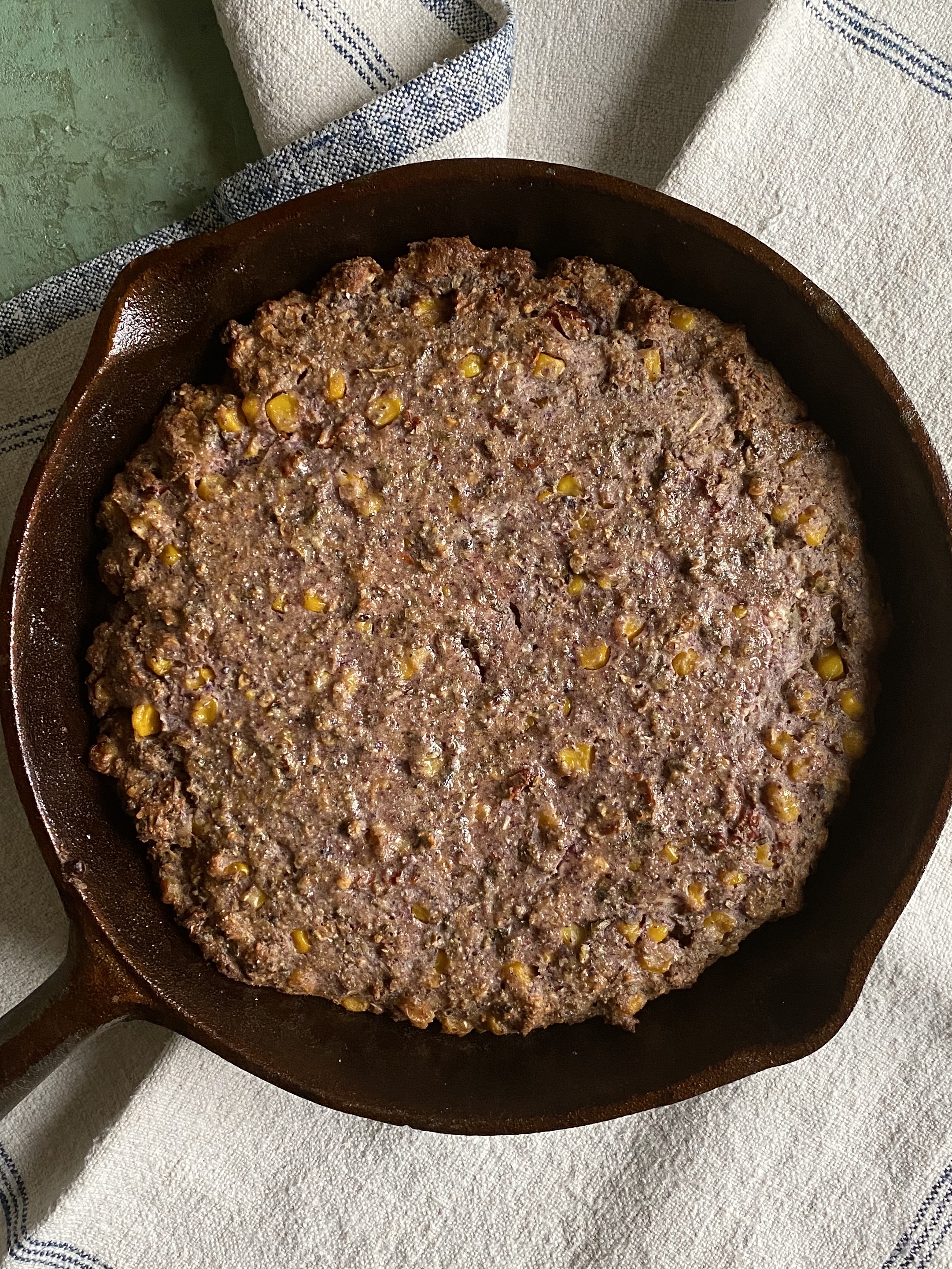 Heat a 9.5” cast iron frying pan in the preheated oven for 5 or 10 minutes. While it’s heating, combine the cornbread mix with the eggs, corn, semi-dried tomatoes and cheese in a mixing bowl. Let the mixture sit for 5 minutes or so to let the flavors marry.