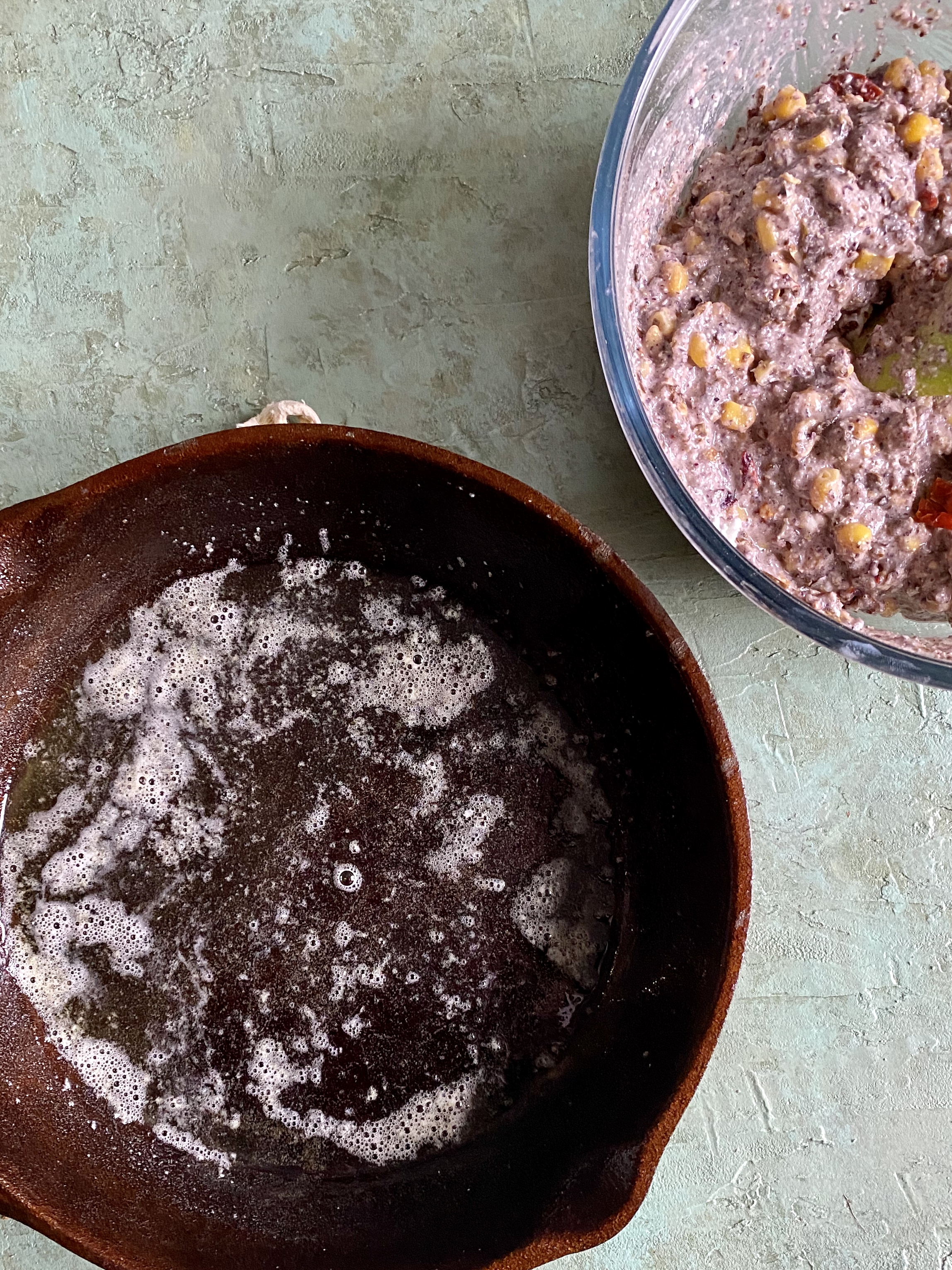Heat a 9.5” cast iron frying pan in the preheated oven for 5 or 10 minutes. While it’s heating, combine the cornbread mix with the eggs, corn, semi-dried tomatoes and cheese in a mixing bowl. Let the mixture sit for 5 minutes or so to let the flavors marry.