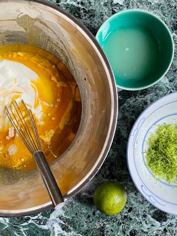 In a medium bowl, mix together the sugar, oil, lime zest and juice, then the buttermilk and eggs. Sift together the salt, baking powder, and flour and fold the dry ingredients into the wet, in three batches.