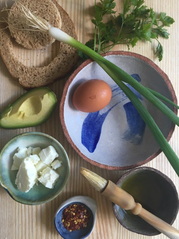 Brush both sides of the slice (with the hole cut out) with olive oil. Heat a small, non-stick frying pan and cook the bread on one side for a minute or two over medium heat. Turn, crack the egg and place in the round. Cook until the white is solid but the yolk still runny – about 4 or 5 minutes.