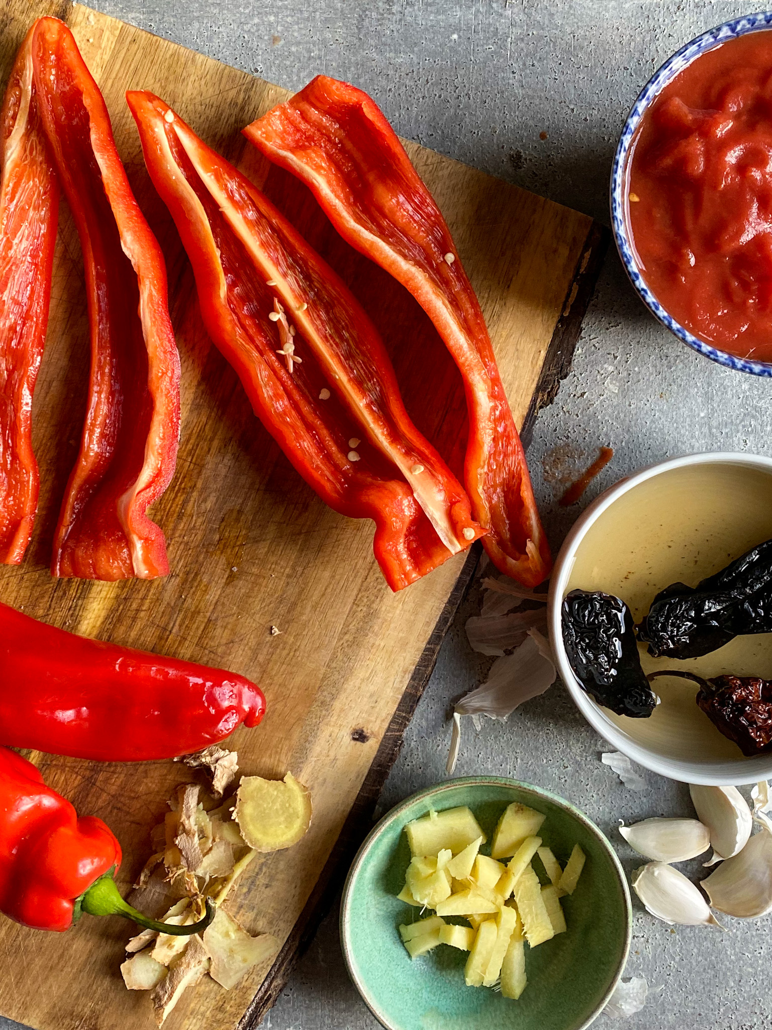 Place the peanut butter, miso (if using it), chopped ginger and garlic, lime juice, soy sauce and the habanero chile (ditch the water it was soaking in) in the small bowl of a food processor. Blitz. You’ll probably need to add a tablespoon or two of hot water if it’s too thick.