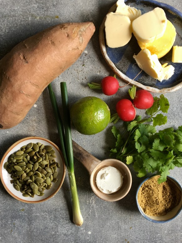 When the sweet potatoes are done, slice down the middle, add a healthy spoonful of the butter. Divide the cheese between the servings, add the sliced radishes and spring onions and garnish with a sprinkling of pumpkin seeds and the extra cilantro. Eat it up while it’s hot and then in bed – it’s a school night.