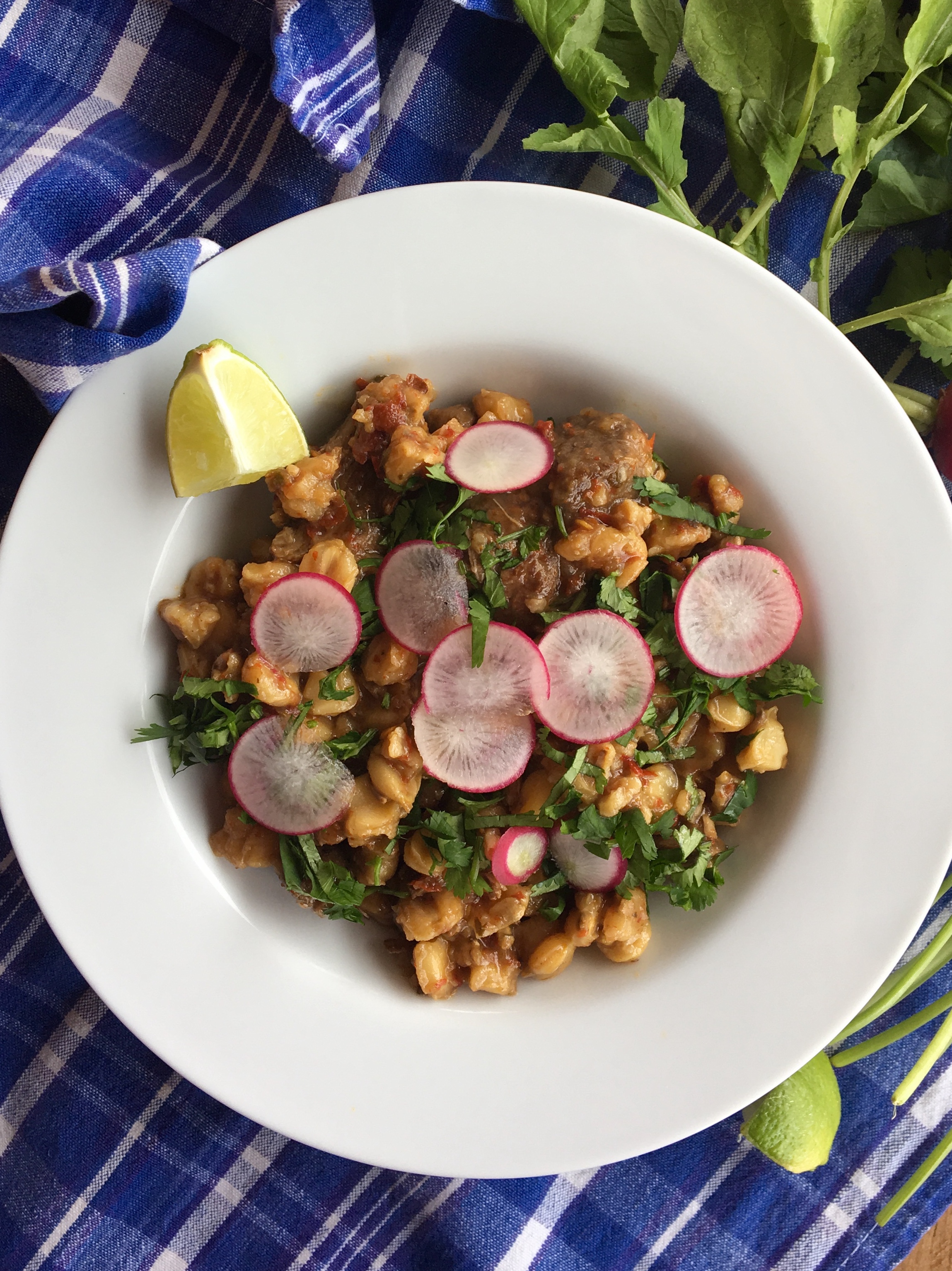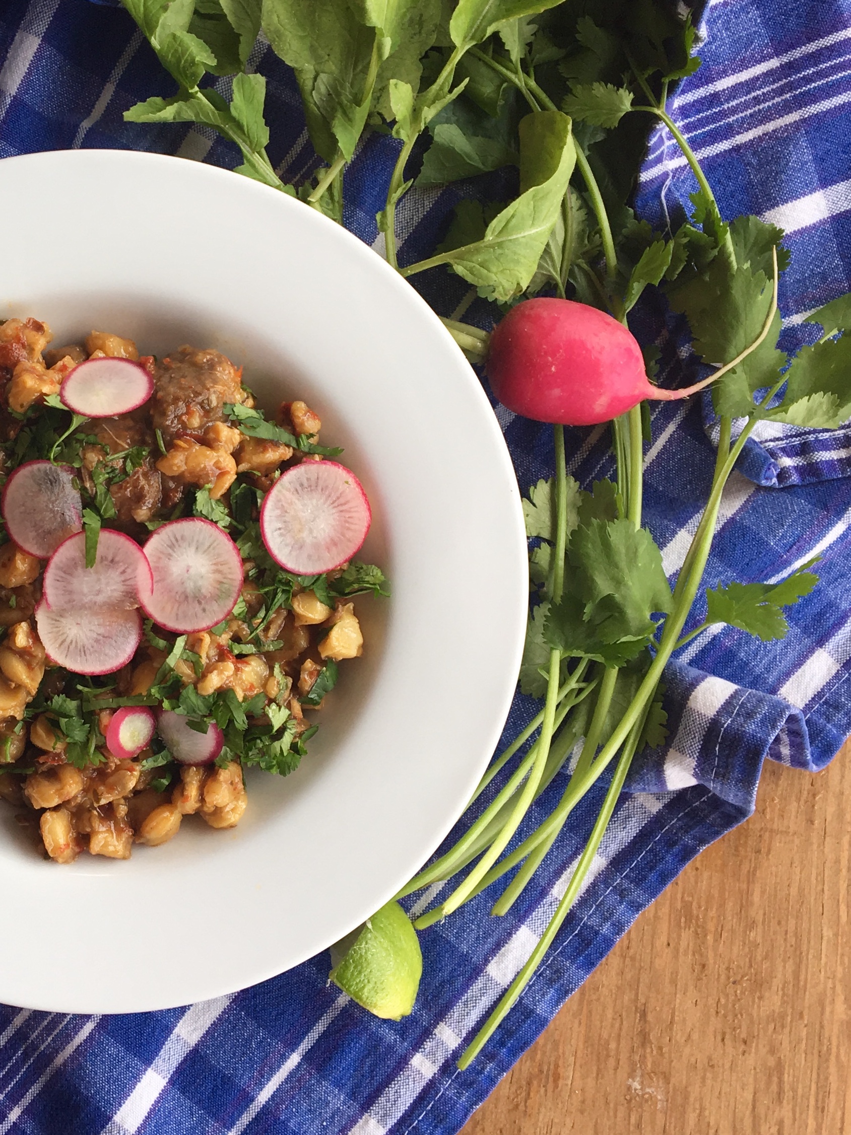 When the squash is cooked, drain and rinse the beans, add them to the soup along with the greens. Stir, taste and add salt and more chile if desired. Remove the chile pod and serve.